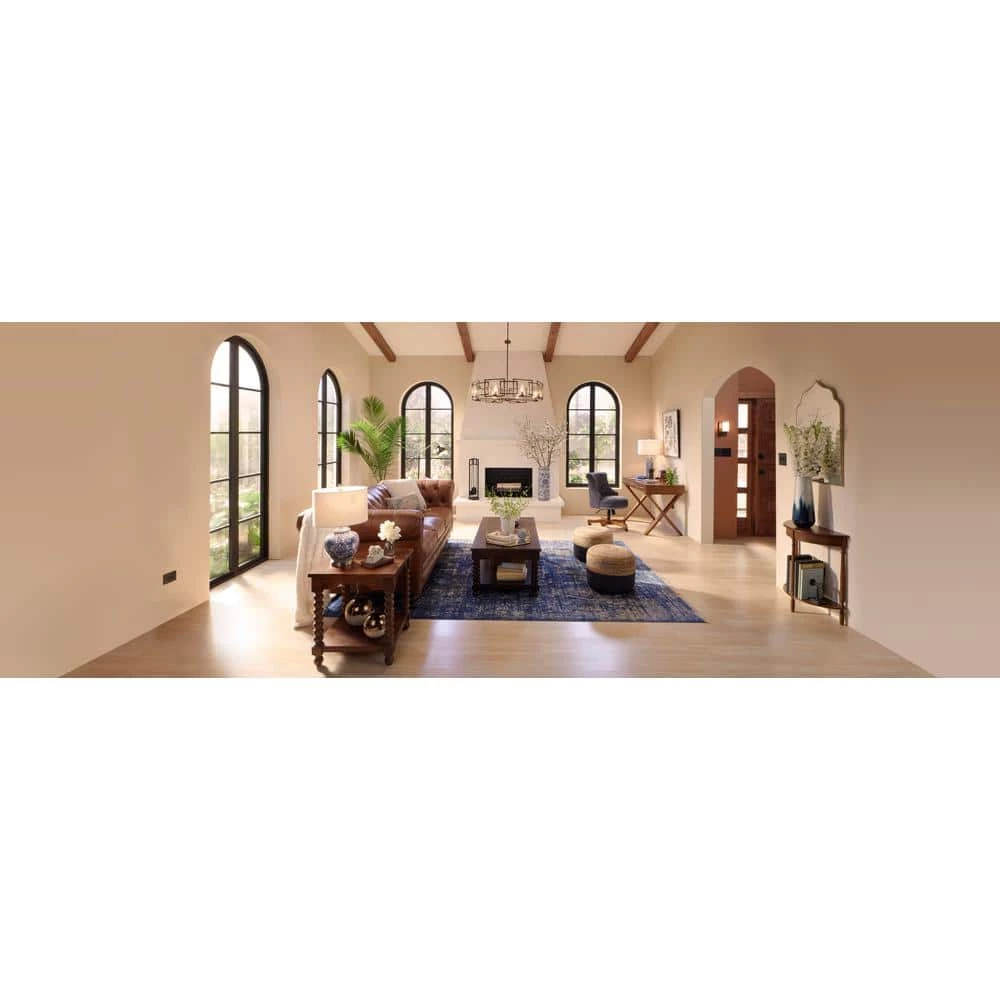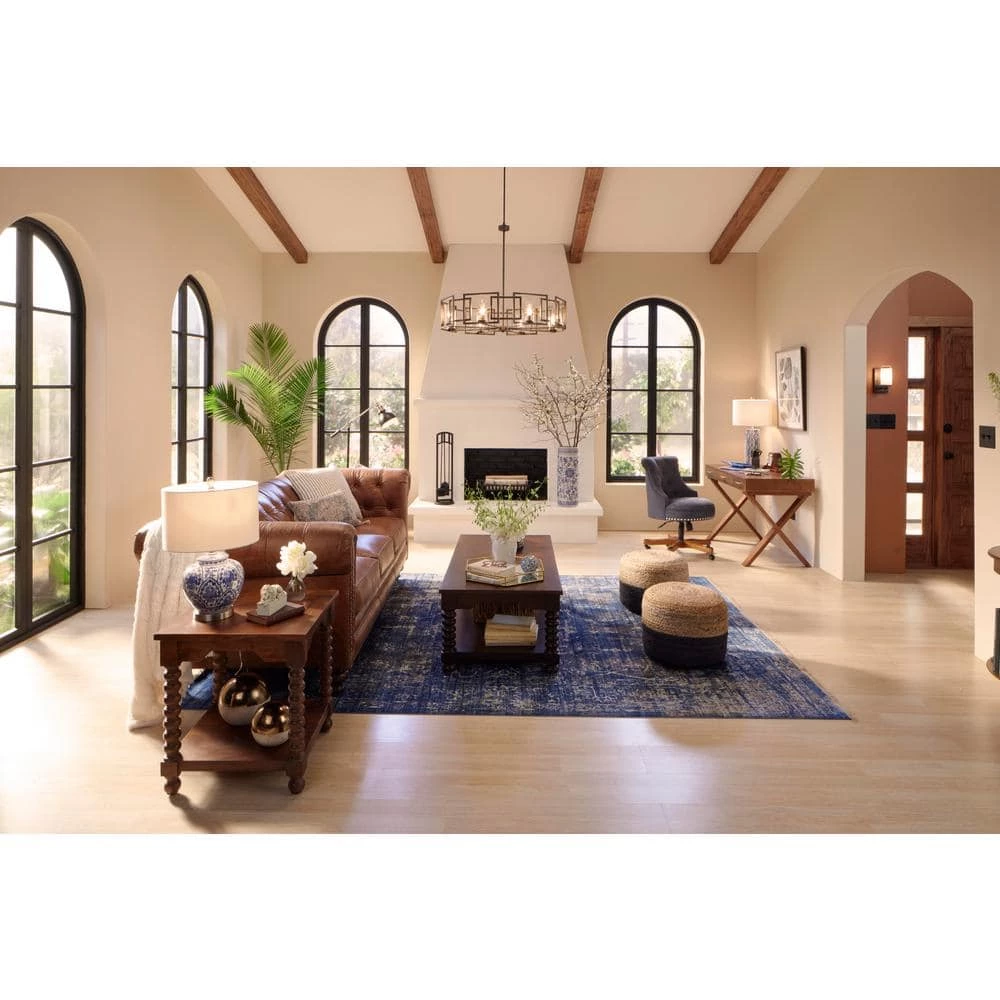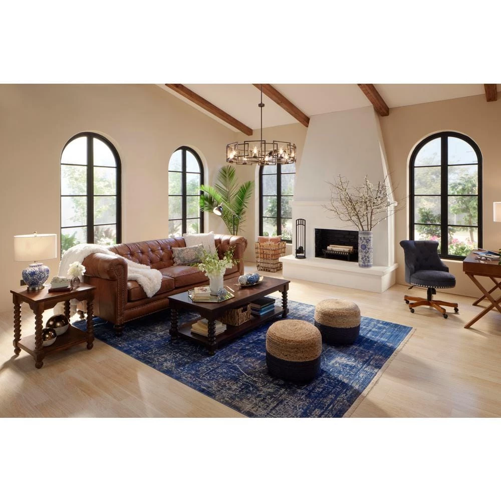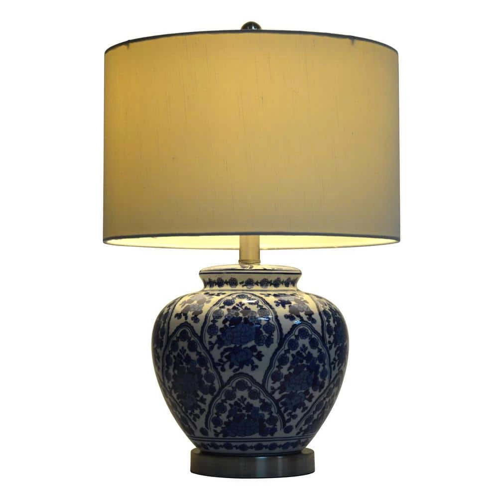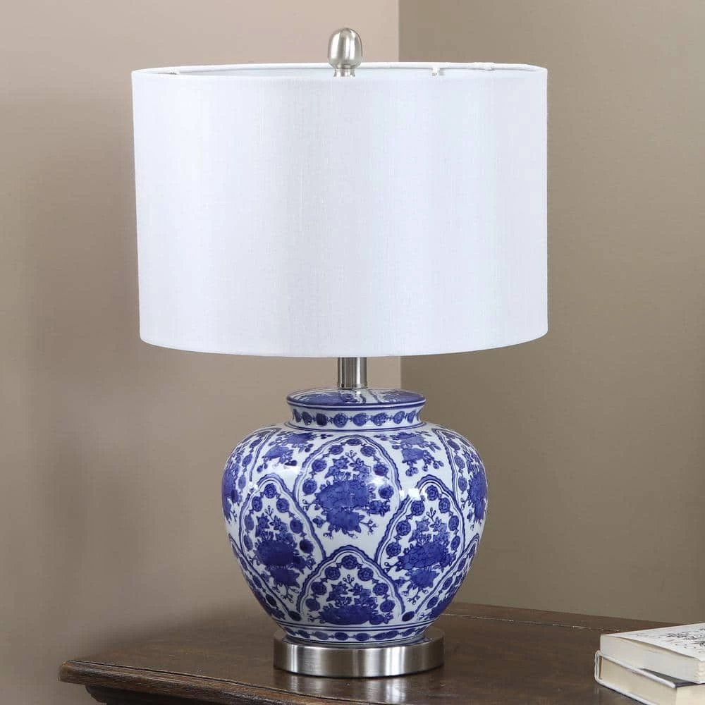 A cheerful blue and white ceramic table lamp features accents of brushed nickel. Complete with a white cotton shade. Table lamp accommodates 150-Watt bulb (not included).