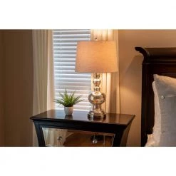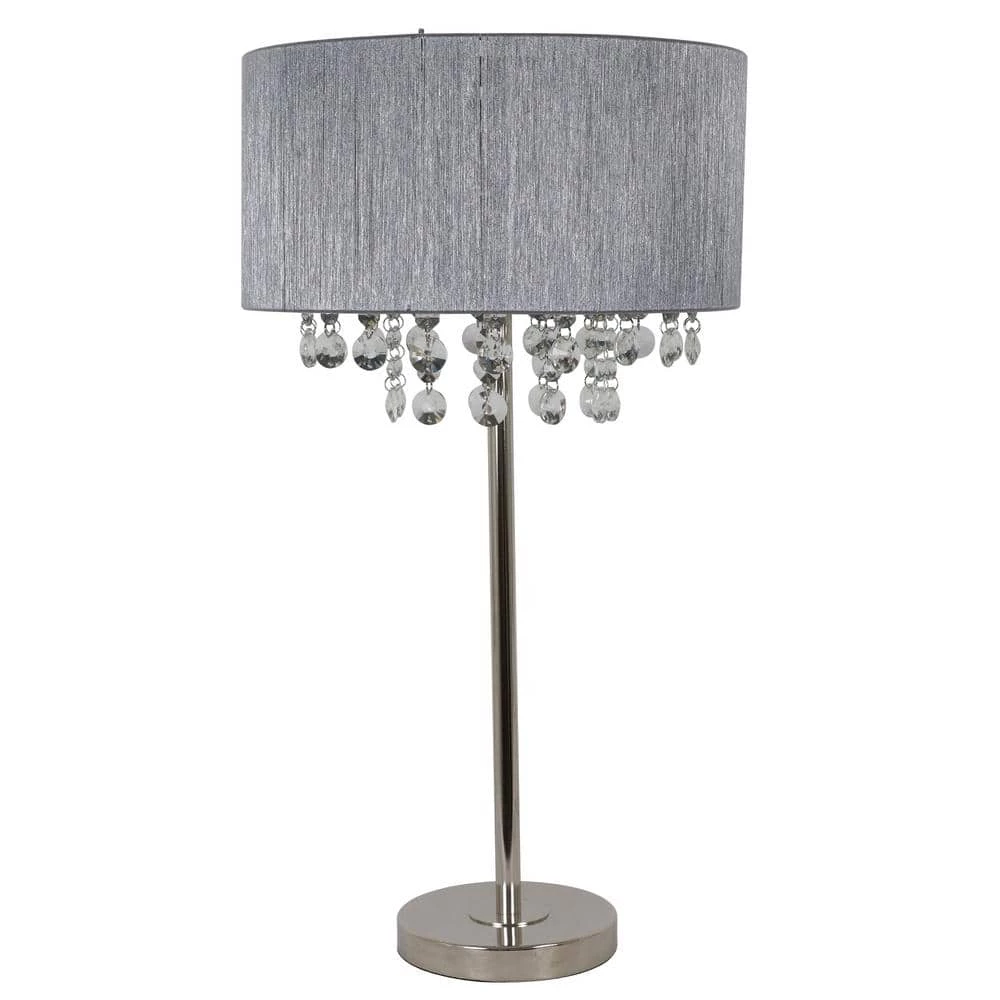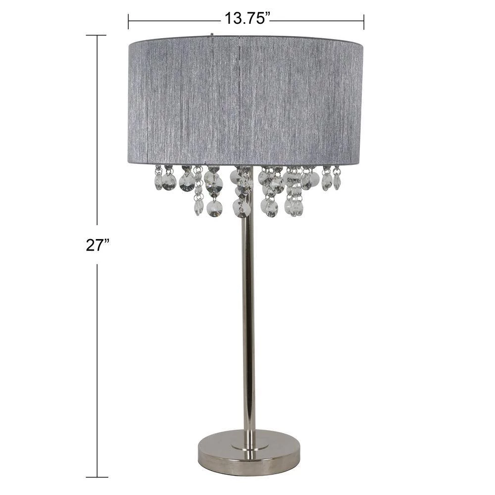 Tiers of dangling crystals define the feminine sparkle of this mid-size table lamp. The wide drum shade is constructed of wrapped lurex string, working in tandem with the suspended faux-jewels to provide a shimmer when backlit by a standard bulb. A polished metallic stand and base ground the lamp.