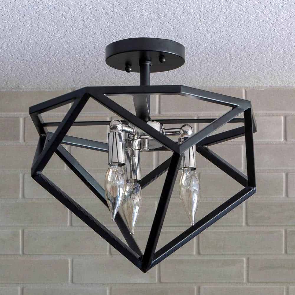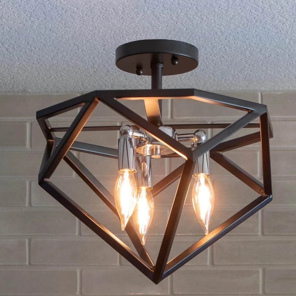 Greet guests with a warm and welcoming glow while you grab their attention with the shapely Alexa geometric semi-flush mount ceiling light. Crafted from metal, the cage style frame features an open framework design and hangs closer to the ceiling, keeping your room feeling airy. In the center you will find three exposed candelabra lights for a modern look. Finished in a neutral and timeless tone that compliments an array of home furnishings. Constructed of steel and copper. Requires three (3) 60-Watt bulbs, not included. Measures 14 in. x 14 in. x 14 in.