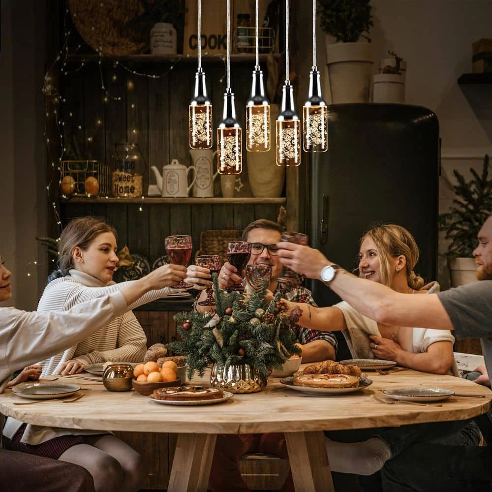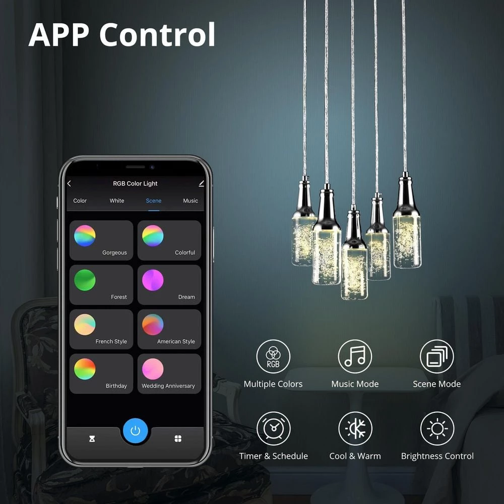 Bistro Smart Pendant Light features a bubble beer acrylic shade that creates an eye-catching glow. It is not only lighting, but also artistic decoration. This is the ideal fixture to be installed in the living room, cooking island, restaurant, loft, bar, shop, balcony, stairs, club, cafe, restaurant. The 5-light pendant is both stylish and energy efficient, the perfect combination for any style of home. You could use the pendant light to decorate your kitchen island, home bar, dinning room, game room, party, bedroom bedside or bathroom. The pendant light features Wi-Fi apps, Siri Shortcut and Voice control technology (compatible with Alexa and Google Home Assistant) to set the pendant light dimmable and RGB multi-color. This pendant light can satisfy not only the various color lighting effect settings, but also the more dim color variations that slowly change. The light fixture is adjustable up to 61.0 in. and can stand alone or be combined for a custom look and is fully dimmable for any mood.