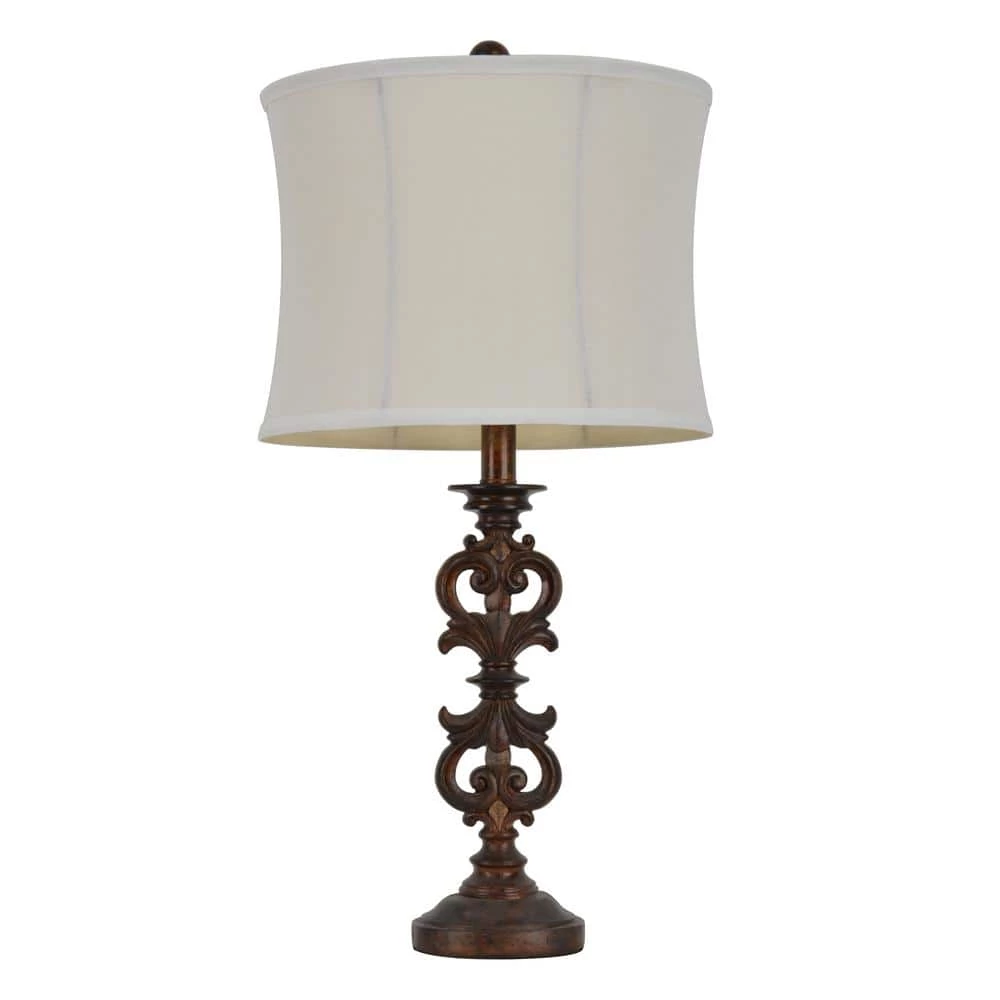 A beautiful dark wood tone. This table lamp is paired with a simple white oval shade that allows the carved design of the base to stand out. Accommodates 150-Watt bulb (not included).