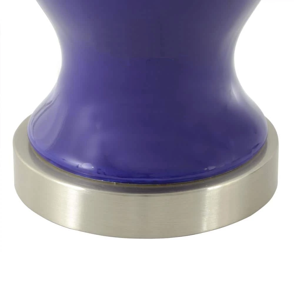 The bright, bold table lamp is constructed of ceramic and finished in a beautiful blue. The neck is brushed nickel, adding a bit of shine. Topped with a linen, making it the perfect accent for any room.