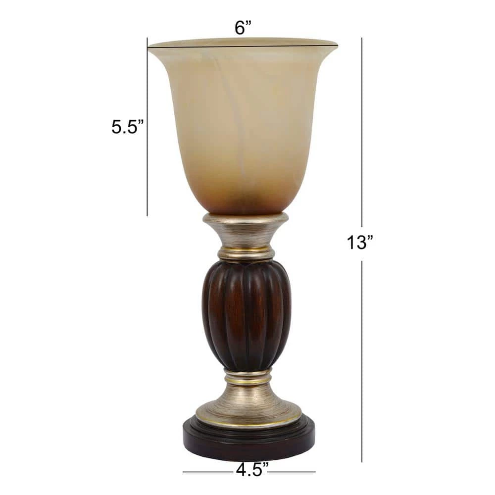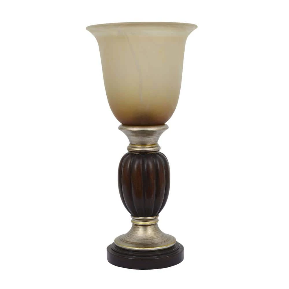This beautiful table lamp has a wood tone finish with champagne accents Product is constructed of resin and glass. Table lamp accommodates 25-Watt bulb (not included) and has an 8 ft. cord. Light assembly is required and ships quickly.