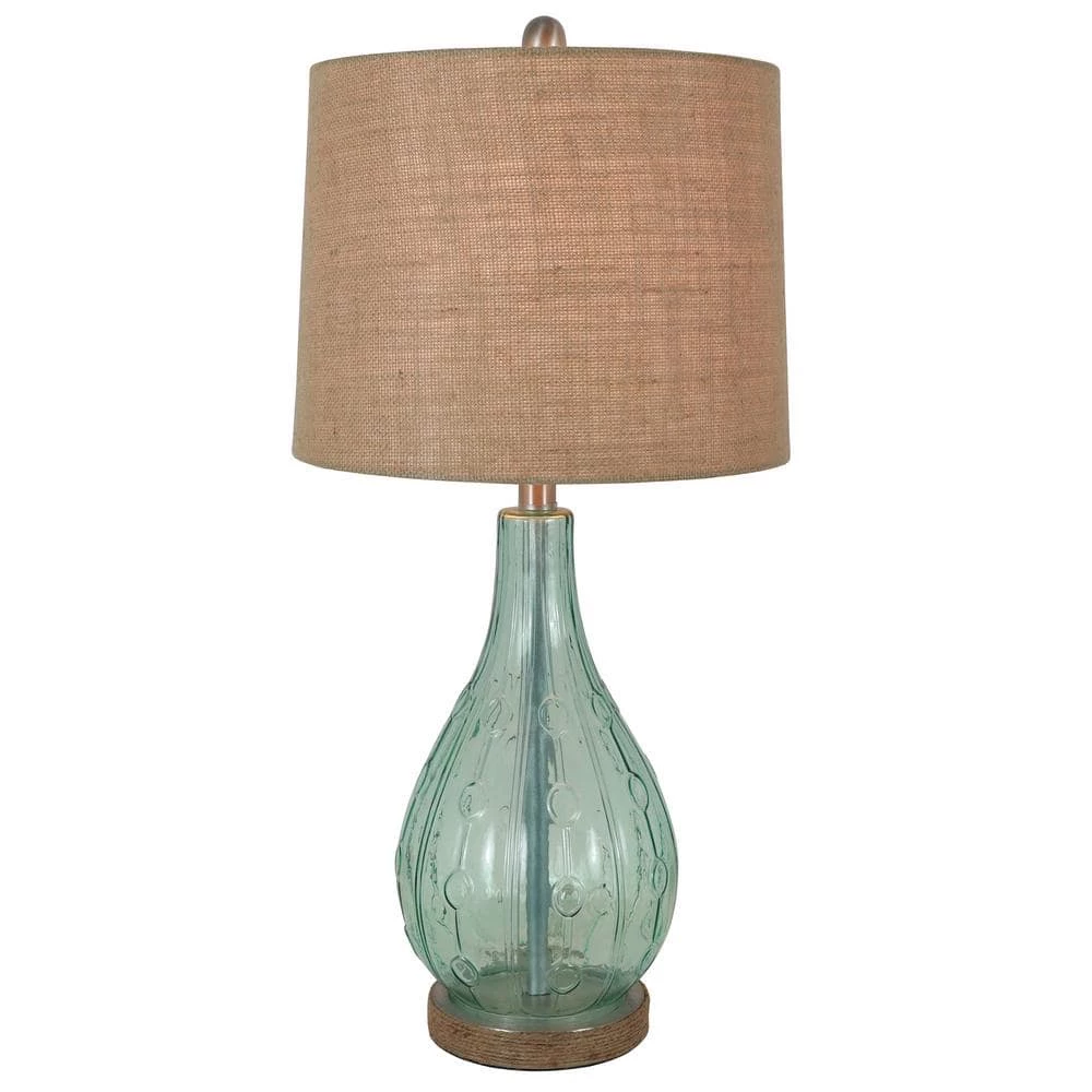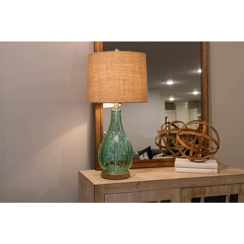 Brighten your family room or bedroom with the versatile Emma embossed glass table lamp. An idyllic combination of casual charm and polished design lends a timelessness that will not age. A transparent glass base keeps this table lamp feeling light and airy. The jute wrapped base and round natural burlap drum shade combine to give this accent lamp the perfect amount of texture and farmhouse character. A tall silver finial acts as a crowning jewel, pulling the entire look together and adding to the simple elegance of the Emma lamp. Constructed of glass and jute. Required one 100-Watt bulb, not included. Measures 13 in. x 13 in. x 27.5 in.