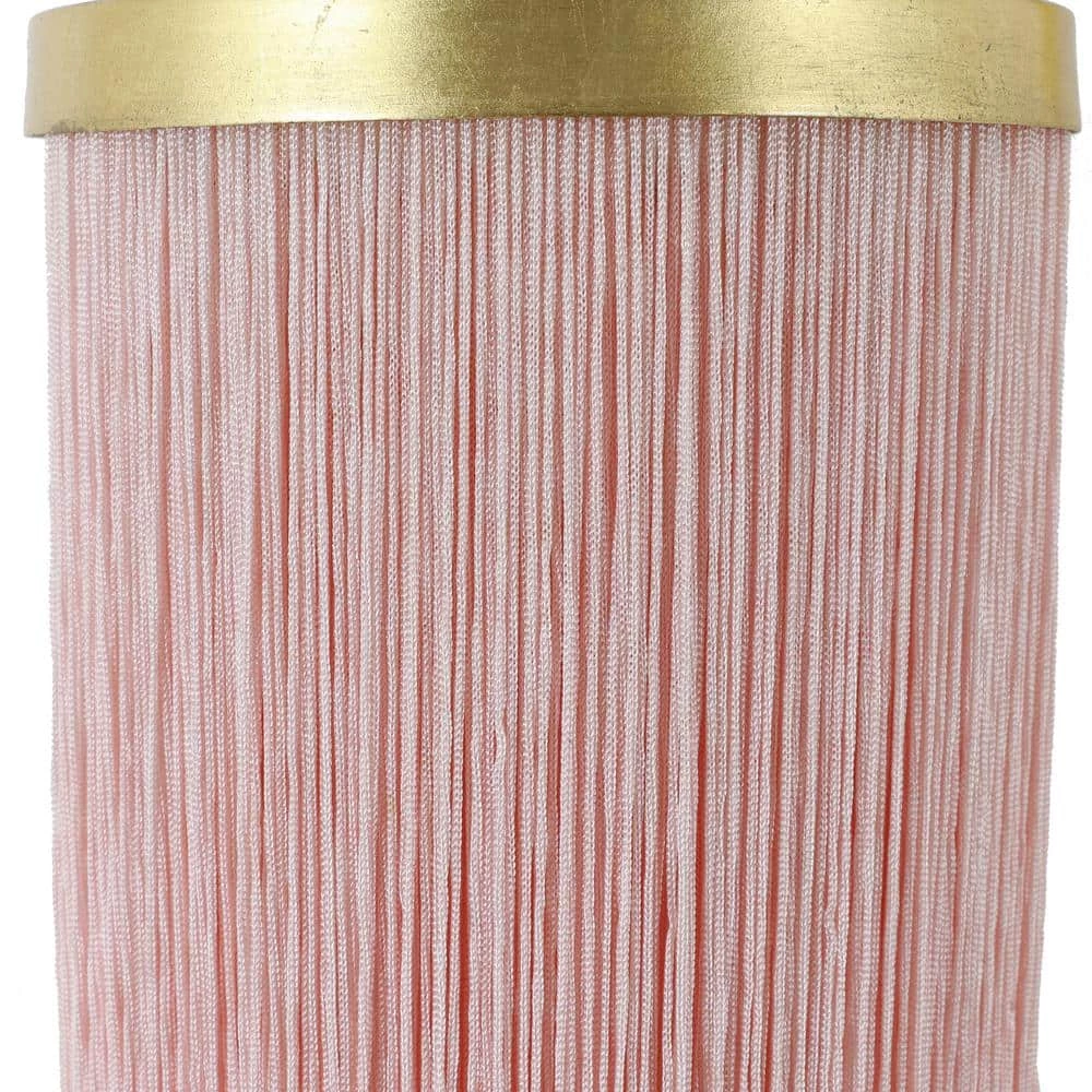 Bring the aesthetic of a French boudoir to your dressing room, vanity or living area with this darling table lamp. The shade is the star of the show, featuring three graduated rows of perfectly placed pink tassel fringe in a round silhouette. The base, which is finished in allover gold leaf tone, is constructed of a simple curved rod with a large round base.