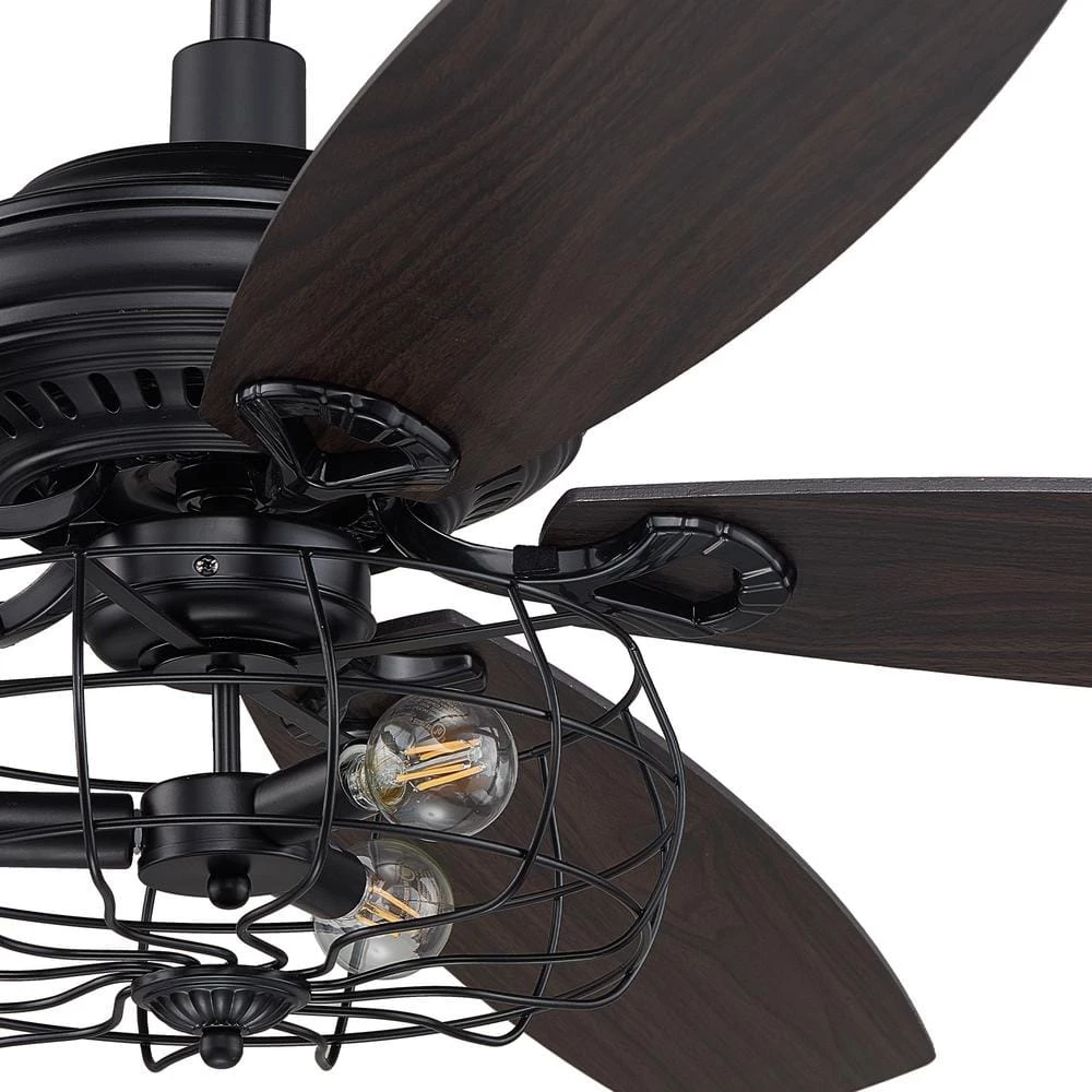- The Henderson 52″ ceiling fan comes alive with five sensationally sturdy, high-quality plywood walnut colorlike blades, a genie lamp-like black cage light, and includes 3xE12 bulb bases (bulb not included).