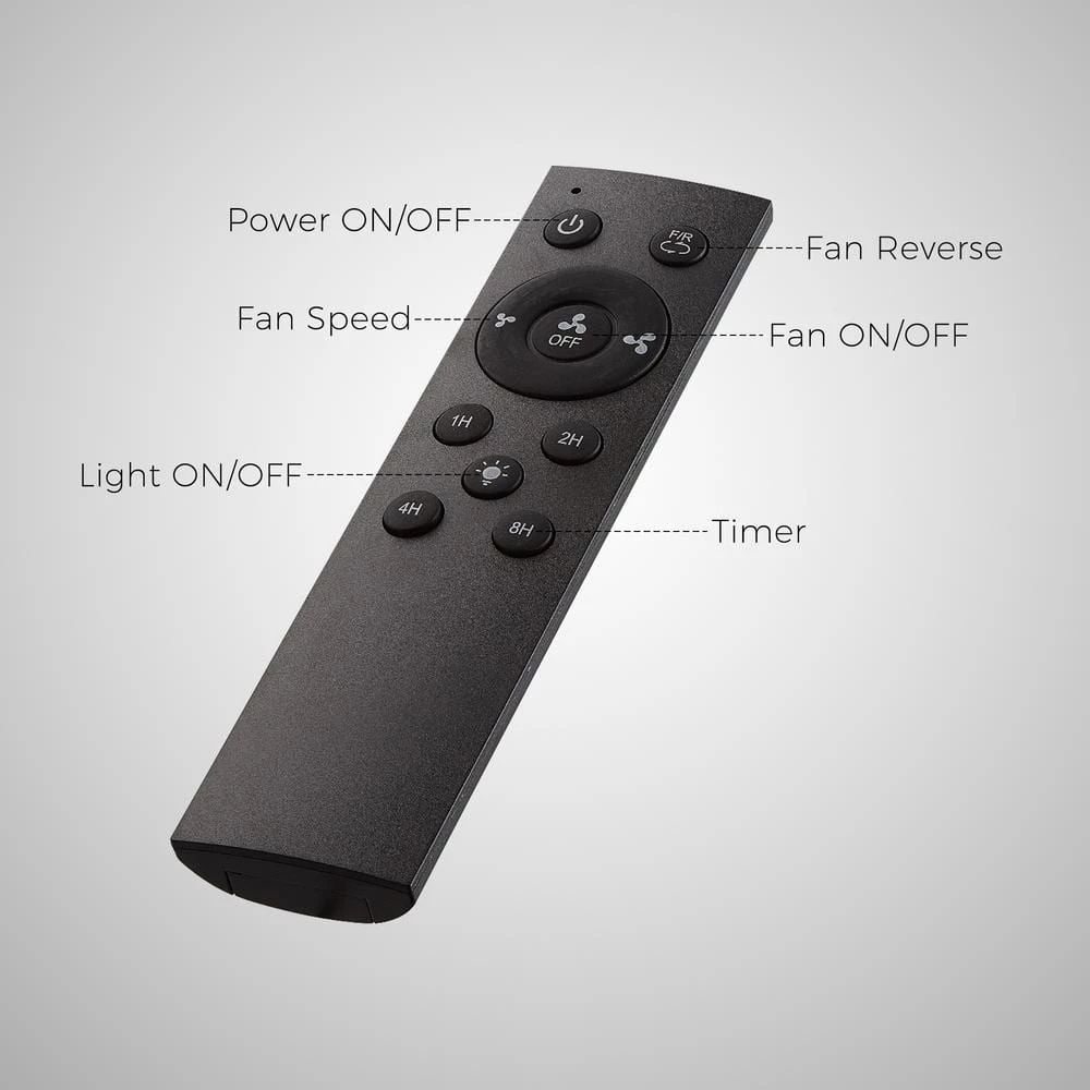- The Henderson 52″ ceiling fan functions on a remote-control system that adjust the timer (1-8 hours), speed, and light settings.
