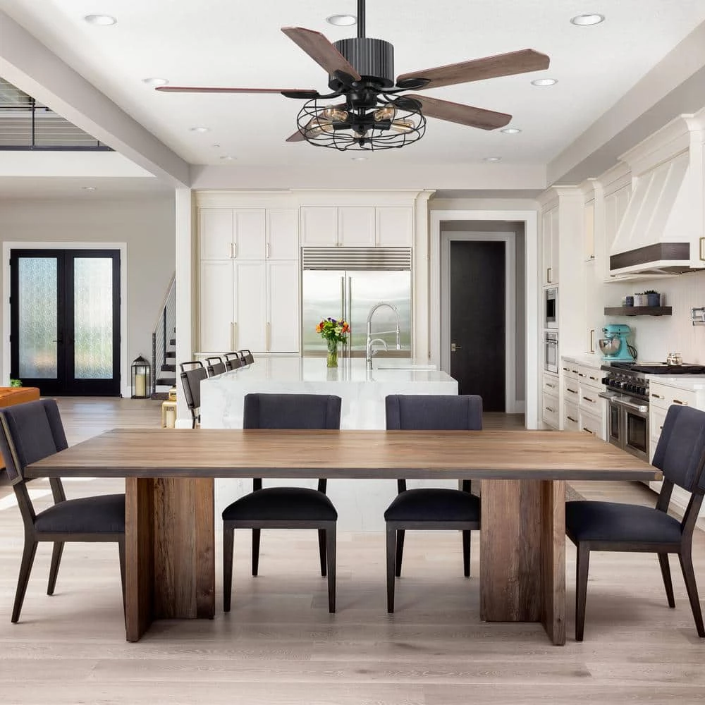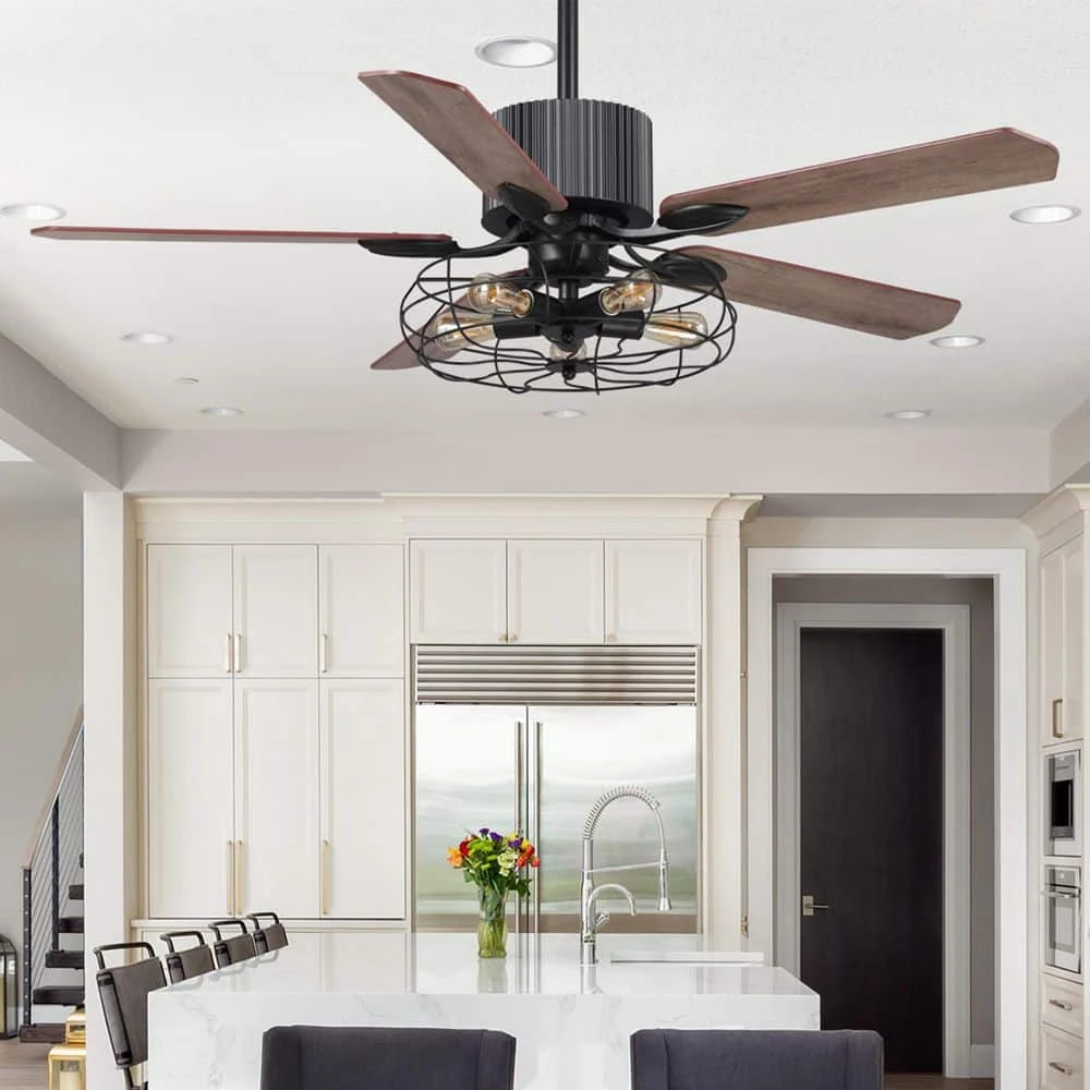 - Heritage 52″ ceiling fan opts for a design with a traditional cage light ceiling fan, perfect as the centerpiece to large rooms. The chic light Southern gothic aesthetic drives home modernity rarely executed to its full potential with the Heritage 52″ ceiling fan. The combination of the black metal base and the lamp-like cage light perfectly encapsulates the candlelight dinner mood in the room.
