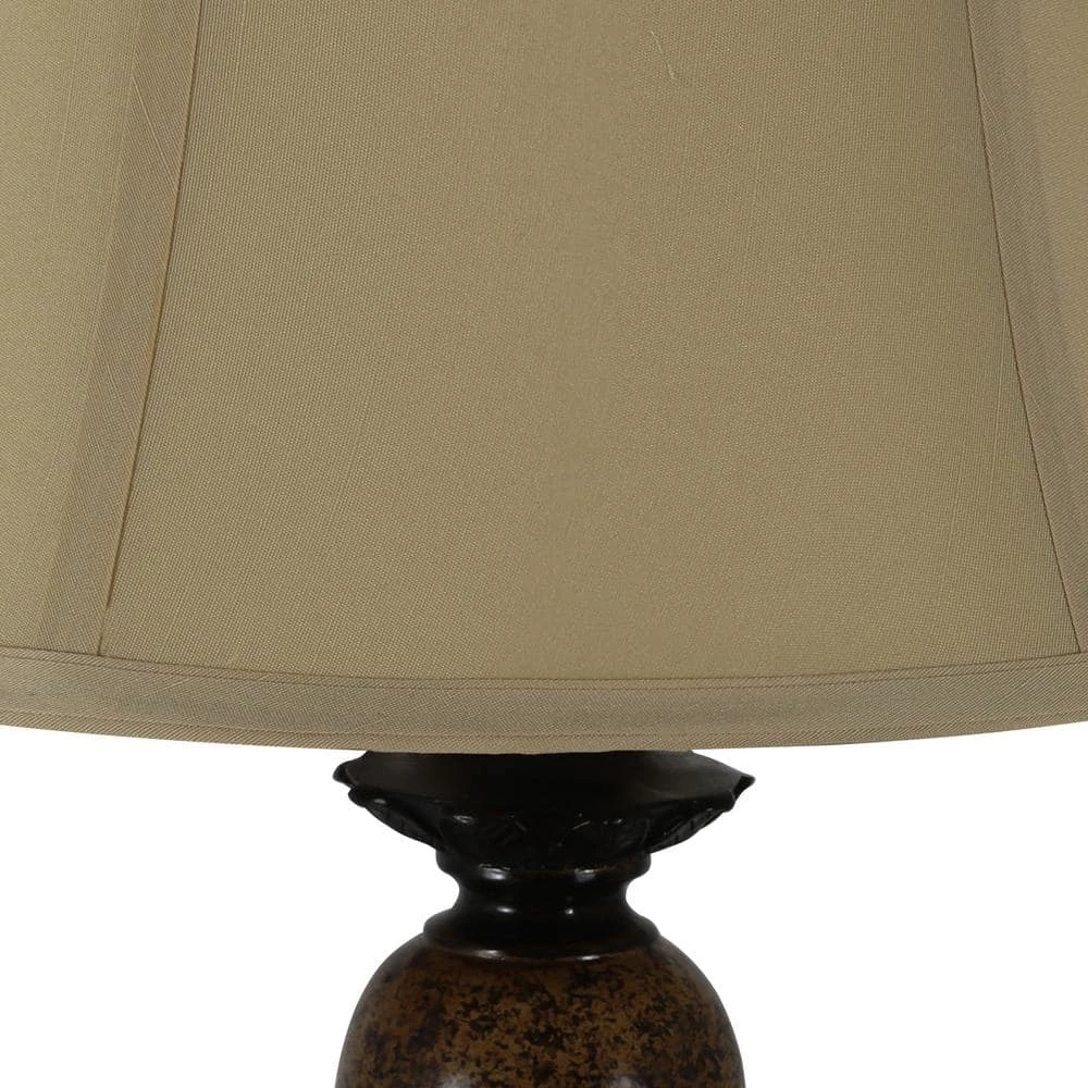 This warm bronze finished table lamp feature a a light marble accent. The taupe fabric shade completes the designer look. Accommodates 100-Watt bulb (not included).