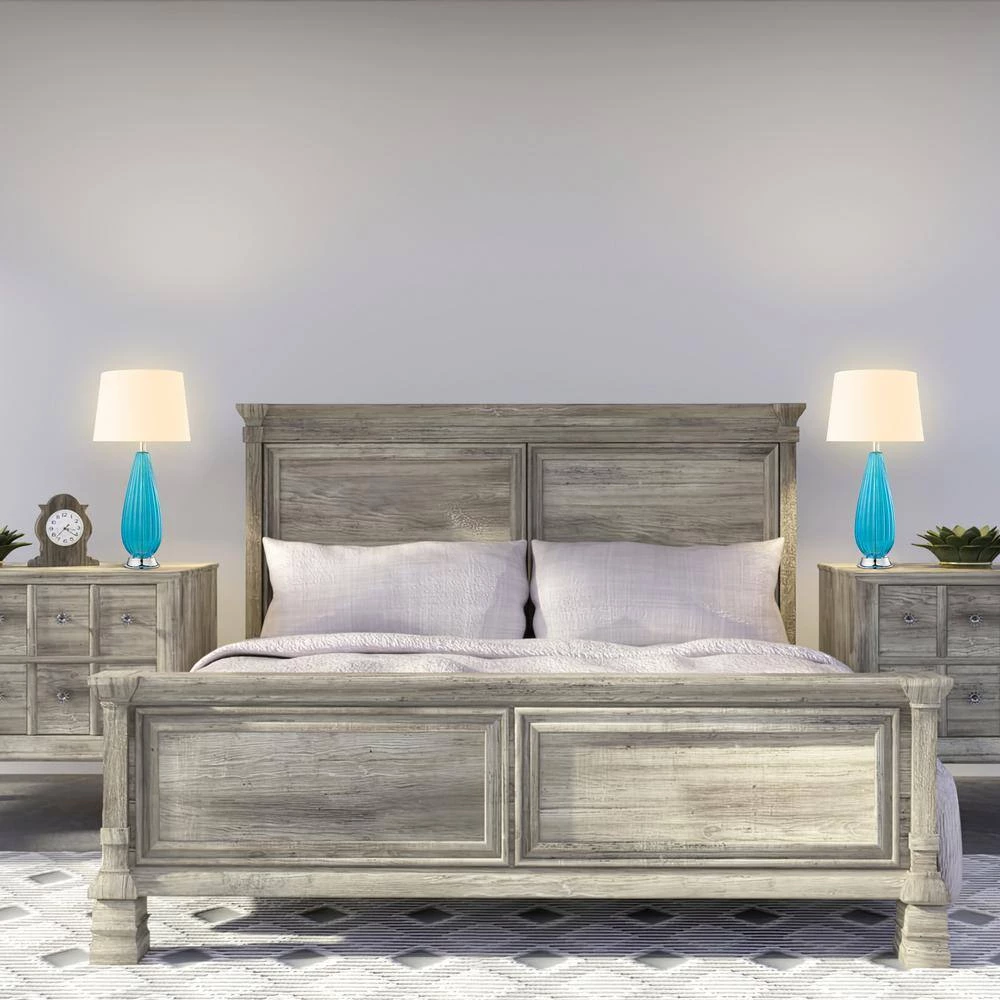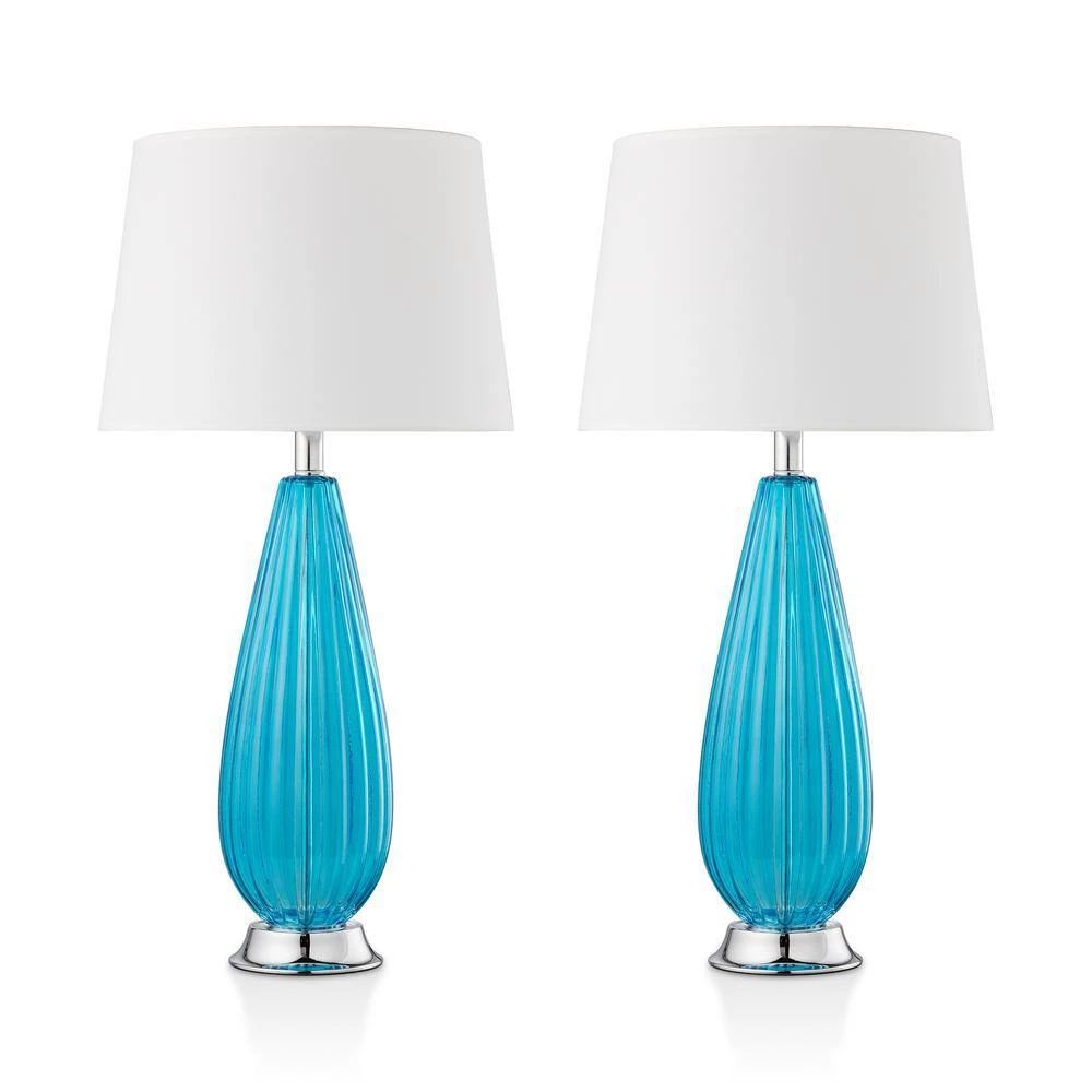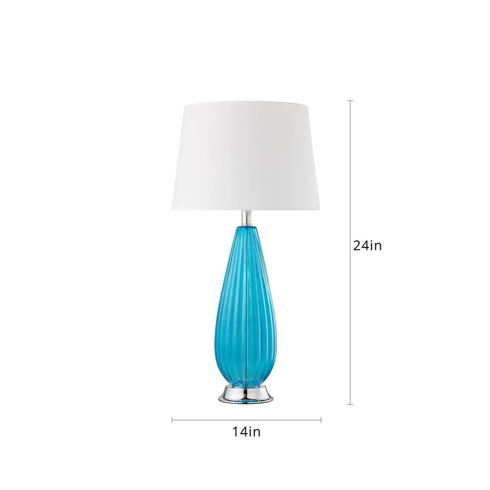 Add Mid-Century modern character to your living space with this clear blue table lamp. Double down on elegant lighting with this set of 2 modern glass accent table lamps. Add a refined twist on your home lighting with Iris table lamp collection. Enjoy the alluring silhouette of this beautiful glass table lamp. It’s fashioned with a sturdy chrome iron base and a ribbed pattern that adds texture and visual interest. It’s topped with a white drum shade that provides a natural complement to the glass and base. Iris Table Lamp Collection will complement any decor, from a traditional to modern style. It is a functional art piece perfect in any room.