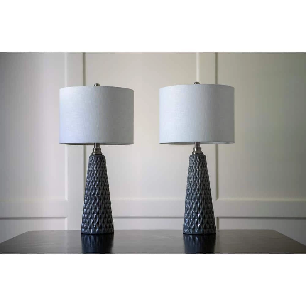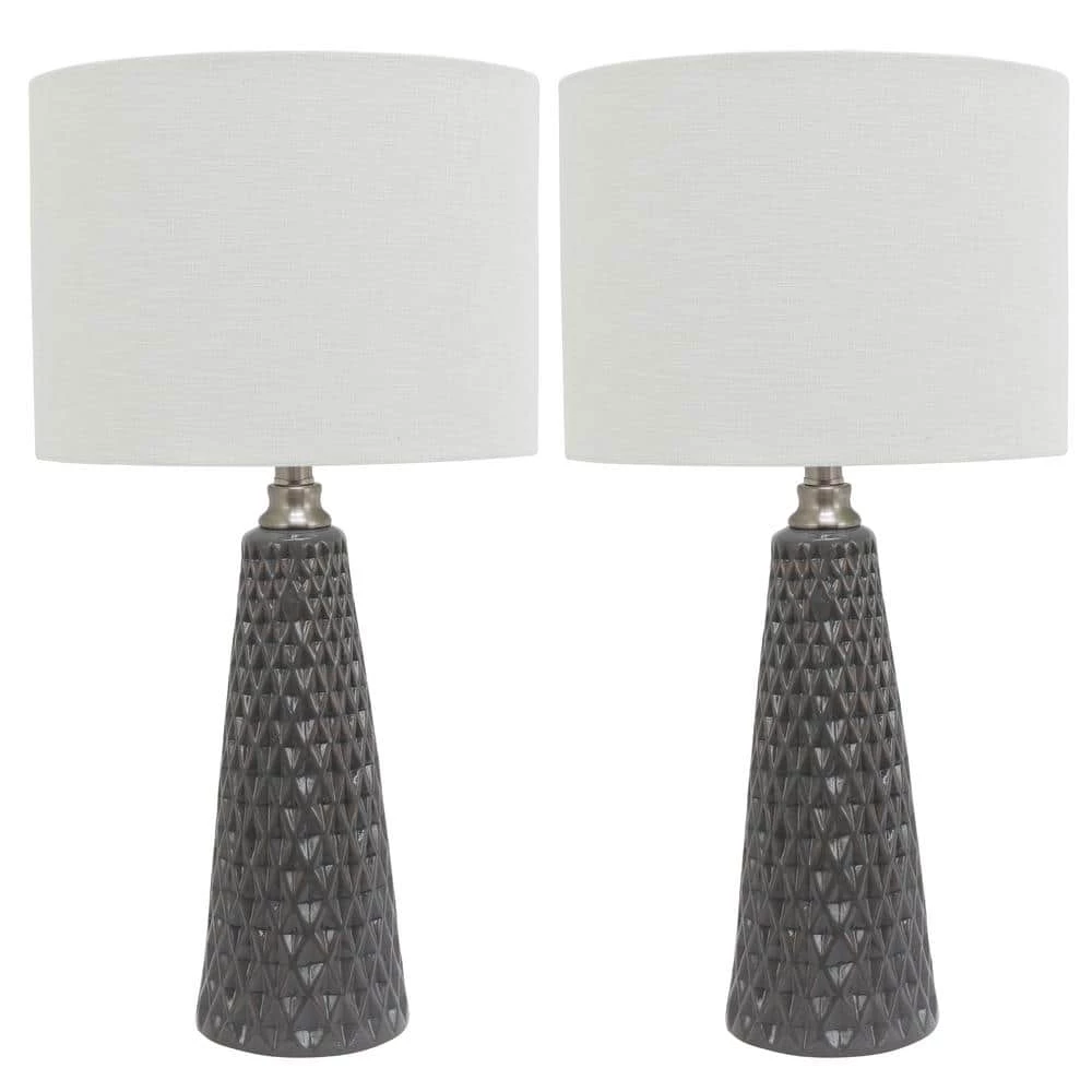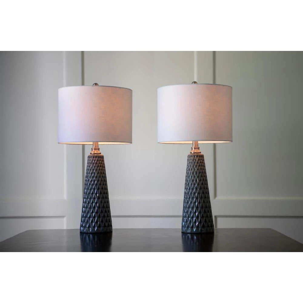 It’s the details that will elevate the design of your living space from basic to professionally inspired. The Jameson Textured Ceramic Table Lamp Set features a sleek, modern ceramic base with inverted faceted diamonds to bring bold texture and dimension to your space. The transitional style table lamps are complimented by round linen drum shades and lovely metal detailing. This set of two table lamps is ideal for framing your bed, sofa or balancing a console table design. Change it up by separating the pair in order to tie two rooms together. The Jameson Table Lamps are available in a variety of finishes. Constructed of ceramic. Required one (1) 100-Watt bulb each, not included. Each lamp measures 13x13x26.5 in.