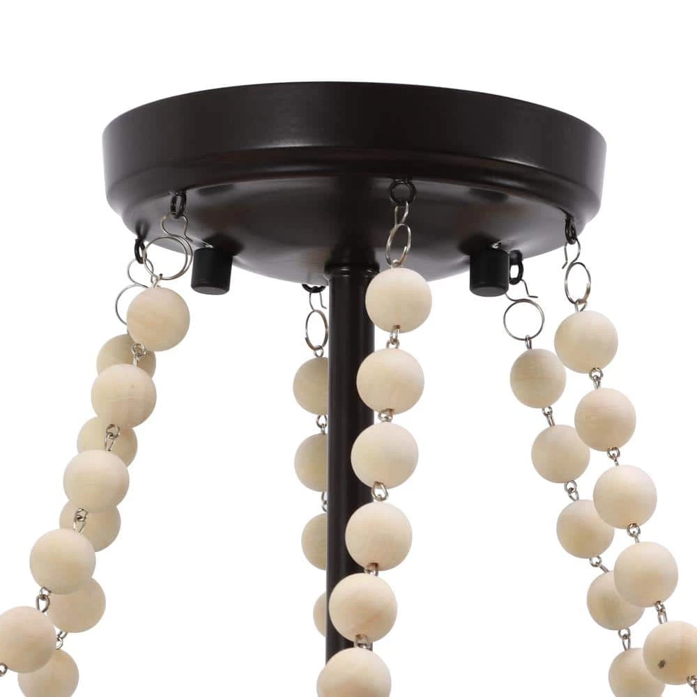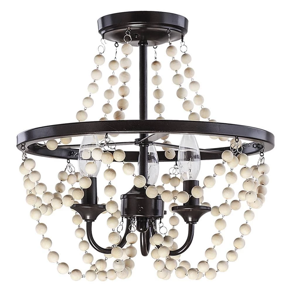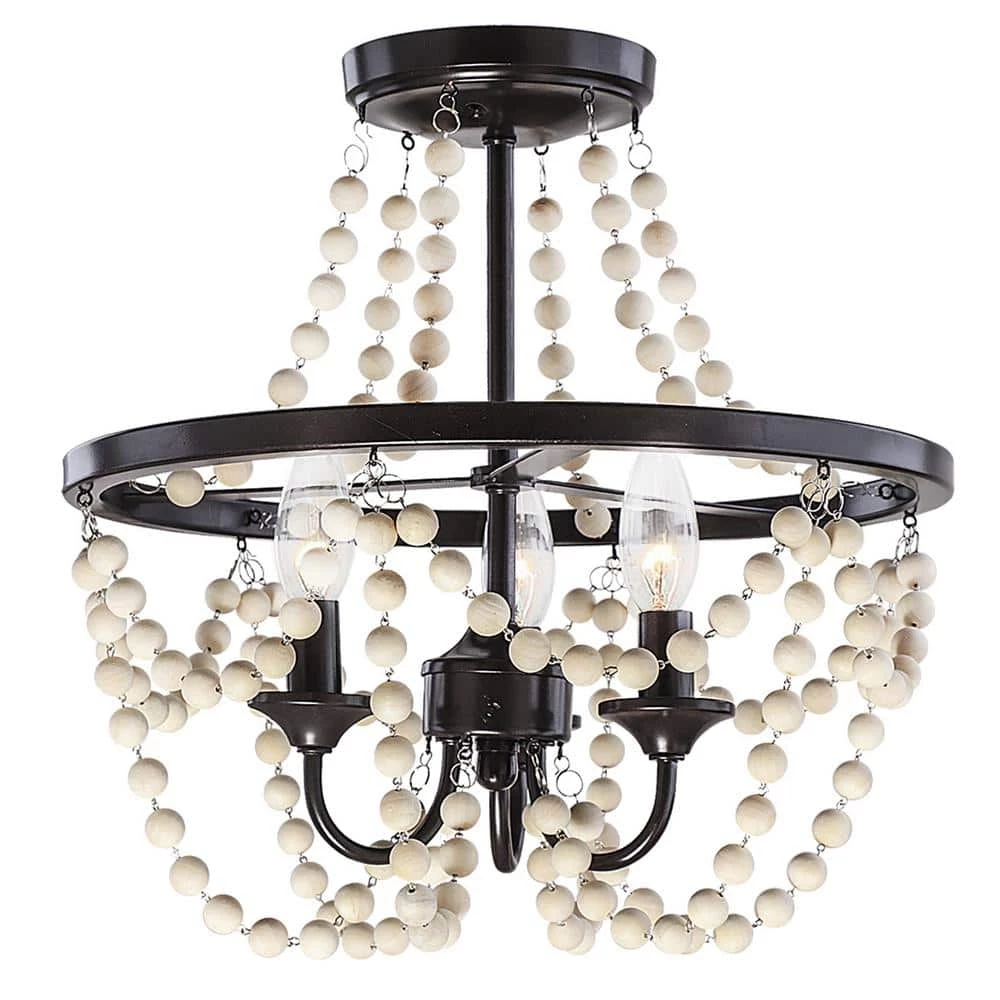 The perfect light fixture has the ability to transform a room by enhancing your design and adding character to the space while also illuminating it. The Jasper 3 Light Metal and Wood Bead Semi Flush Mount ceiling light features clean, modern lines with a wood beaded looped design that keeps your home feeling open and airy. A three lights, enclosed within the beaded fixture draws the eye and adds modern, industrial character. The exposed candelabra bulbs brighten the room and add vintage appeal. Hang this semi flush mount ceiling light above a dining table or in the entryway to complete your modern, eclectic look. Requires three 60-Watt bulbs, not included. Measures: 16x16x14 in. Constructed of metal and wood.