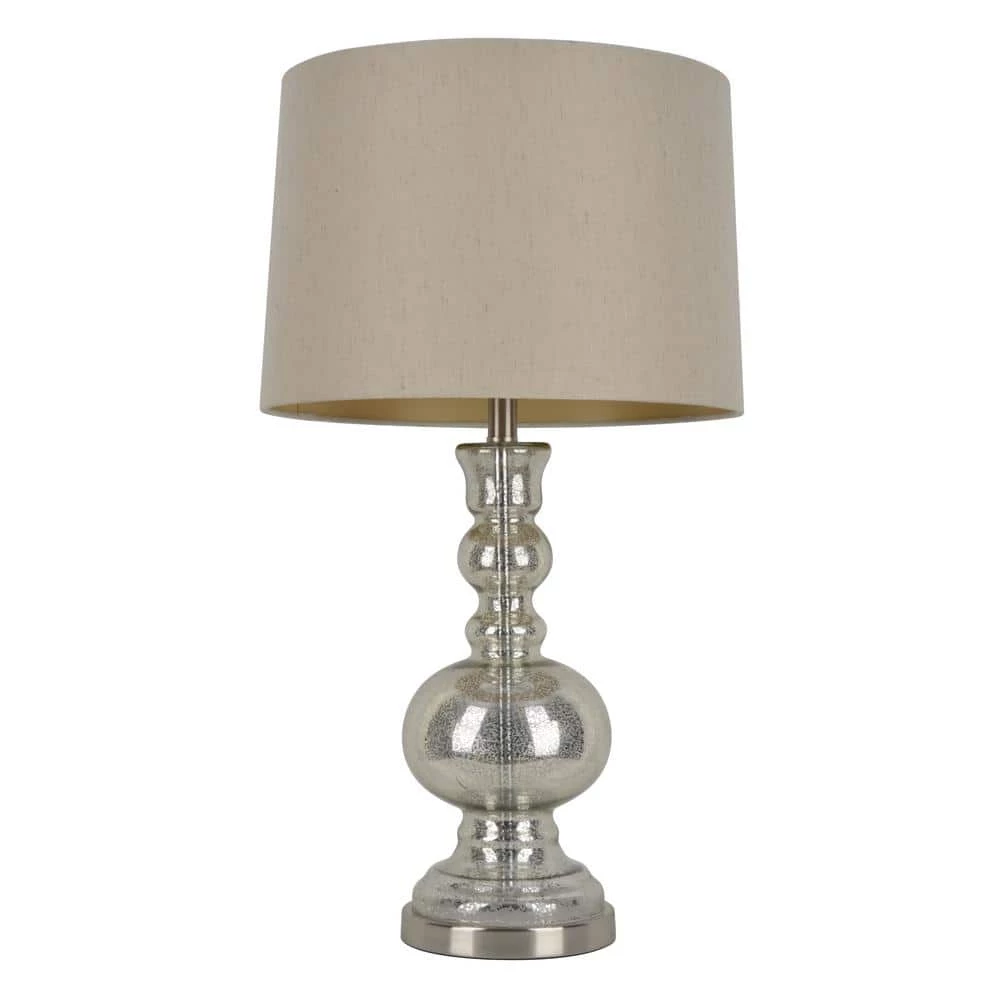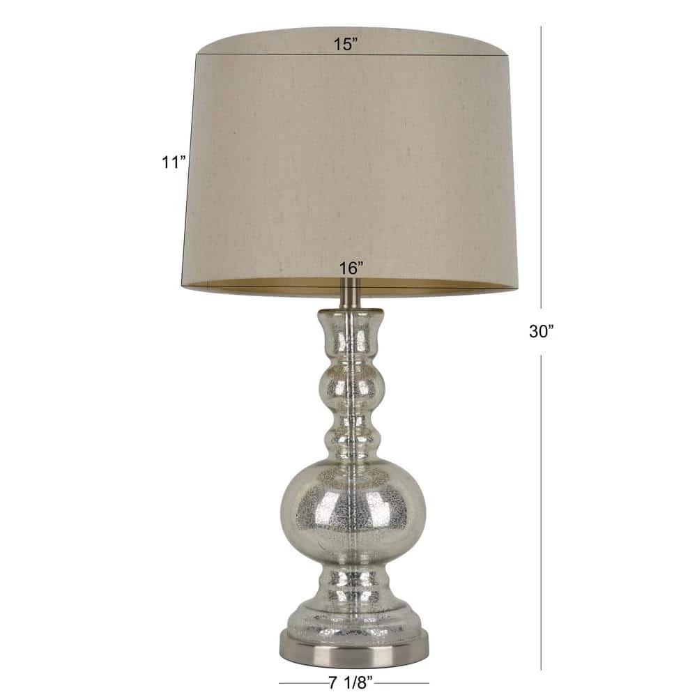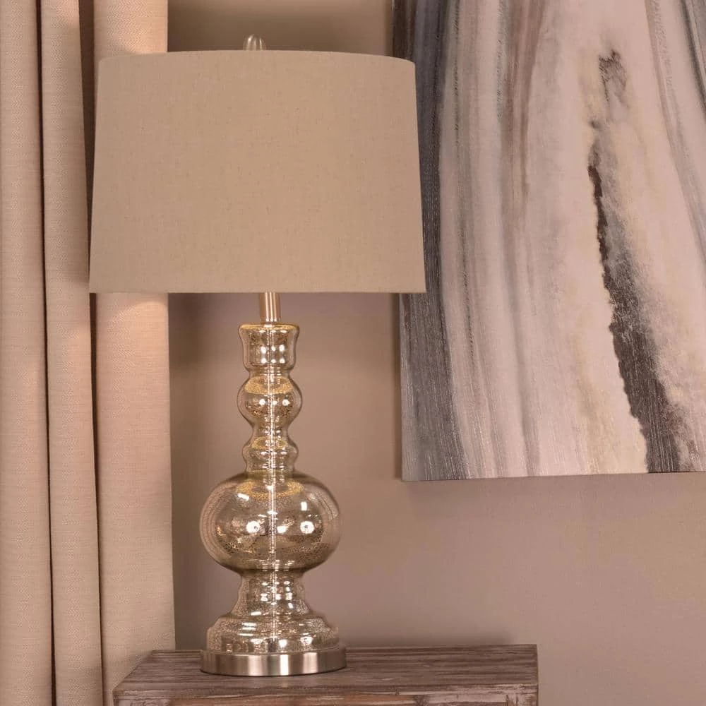 A beautiful mercury glass finished table lamp with a brush nickel base. Paired with a linen shade, this lamp will create a stunning statement in any room. Accommodates 150-Watt bulb (not included) and is constructed of glass.