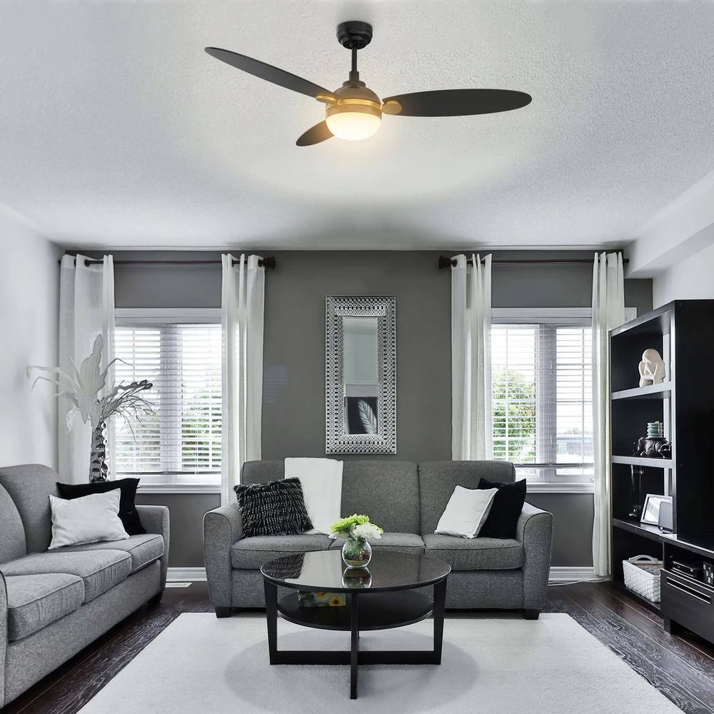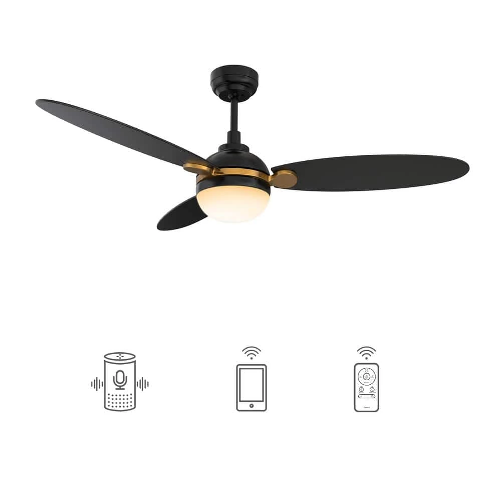 This Raddix 52 in. smart ceiling fan was created to transform your outdoor patio into a beachside resort. Enjoy the cooling and powerful airflow that its long blades deliver during summer afternoons or bask in the warm bright light on winter evenings. The fan features a burnished metal exterior black, complementing blades and elegant gold accents for a modern addition to any home decor.