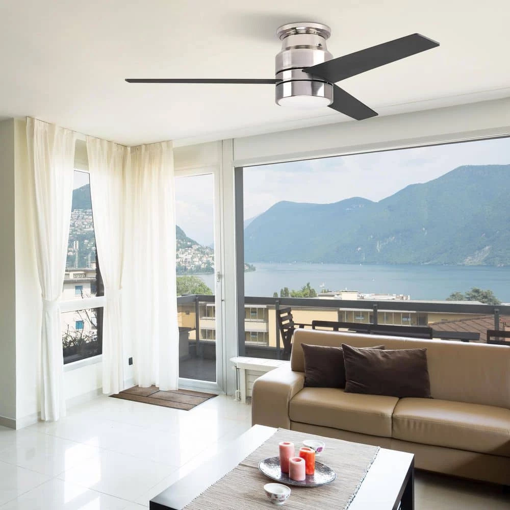 White walls perfectly cast the right light for a gorgeously adorned flush-mounted sliver Ranger 52″ ceiling fan. The Ranger 52″ has a 3-speed reversible AC motor that allows you to change the fan’s direction. With a 3462 CFM high-velocity airflow, you can enjoy the cool down without that unwanted noise. The ceiling fan has an integrated LED light kit with a warm light. The light kit offers lower energy consumption and a longer lifespan lasting over 50,000 hours, from downdraft mode in the summer to updraft mode in the winter. The Ranger 52″ 3-blade ceiling fan also features dynamic airflow and a whisper-quiet AC motor experience, wall control, Wi-Fi apps, and voice control technology compatible with Alexa, Google Home Assistant, and Siri Shortcuts. The indoor ceiling fan comes in various colors: black, gold, silver, and white. Bask underneath the Ranger 52″ ceiling fan.