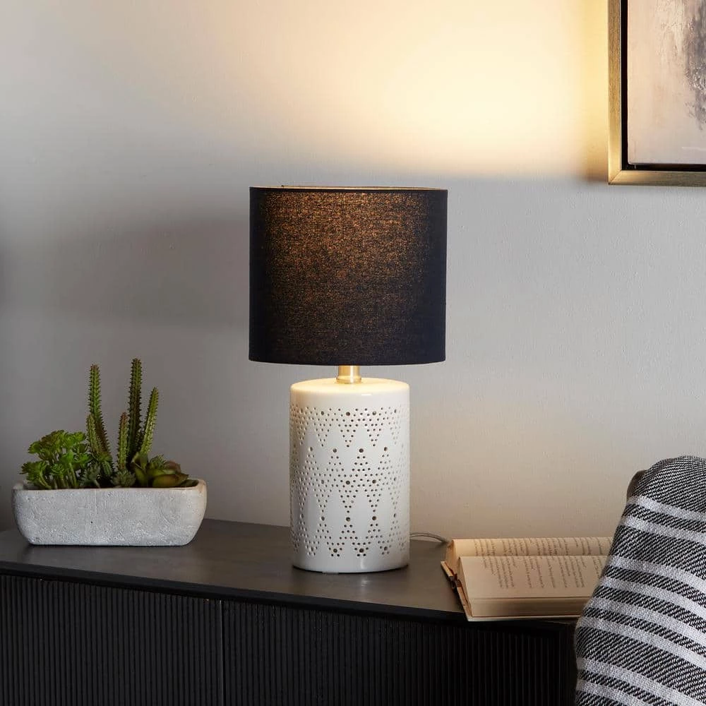 Break out of the norm and allow the Sarah Punched Pattern White Ceramic Table Lamp to grace your living spaces. Crafted in a punched geometric pattern throughout the base. this accent lamp exudes modern appeal like none other. The neutral finish shines bright and compliments the navy lamp shade perfectly. The Sarah will not cramp your style or your space as its height of 15.5 in. makes it conducive for small apartment living and minimal living space. The easy on/off switch makes it highly functional as well. Constructed of ceramic and measures: 15.5 in. H x 8 in. W x 8 in. D.
