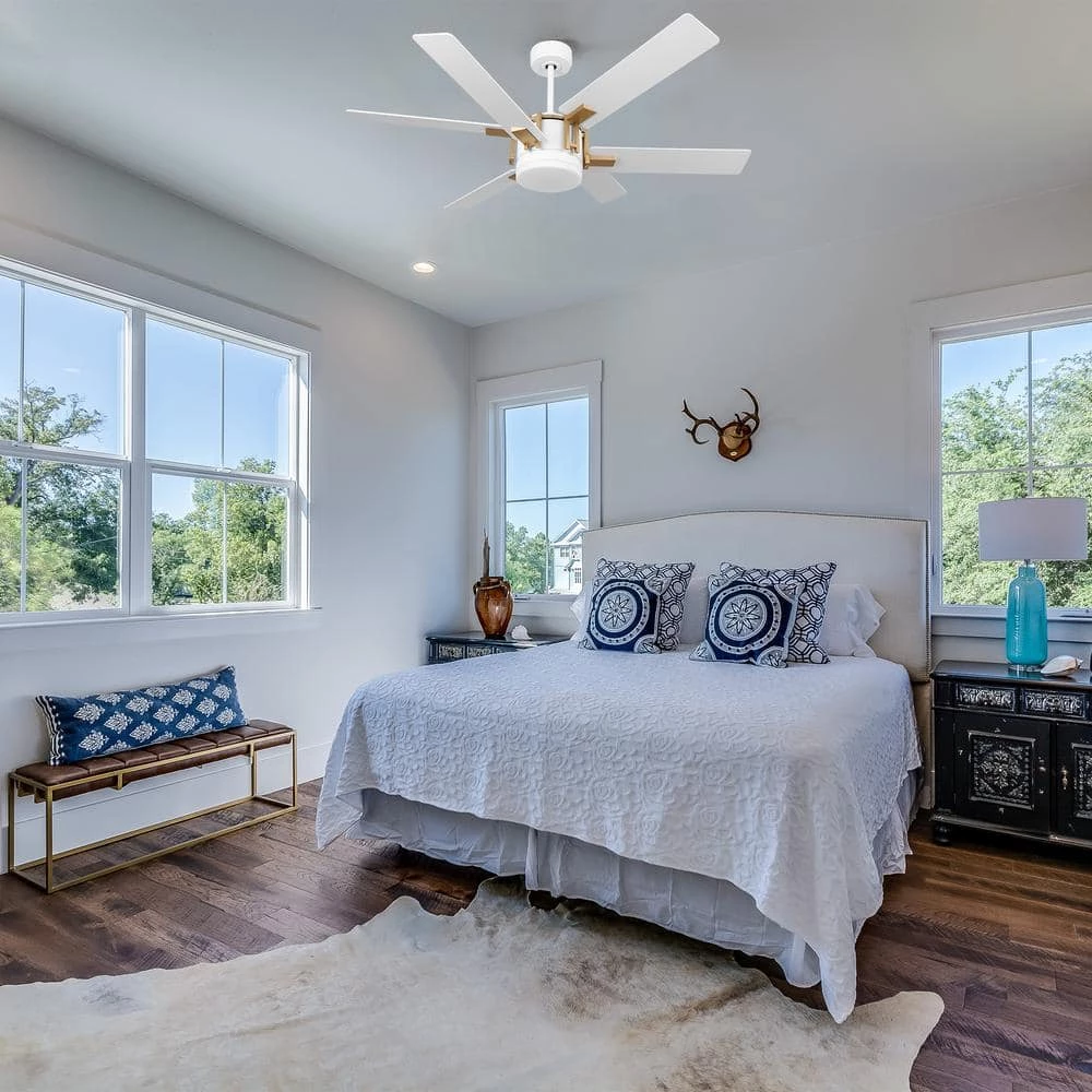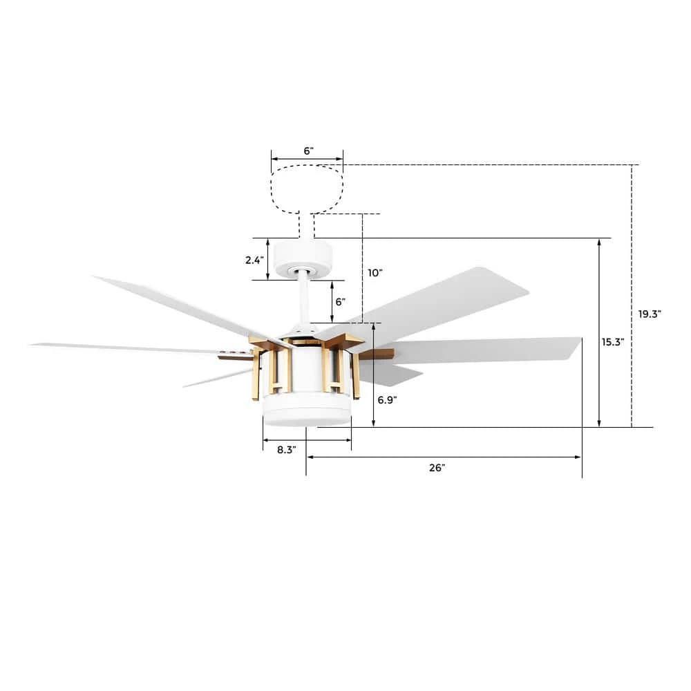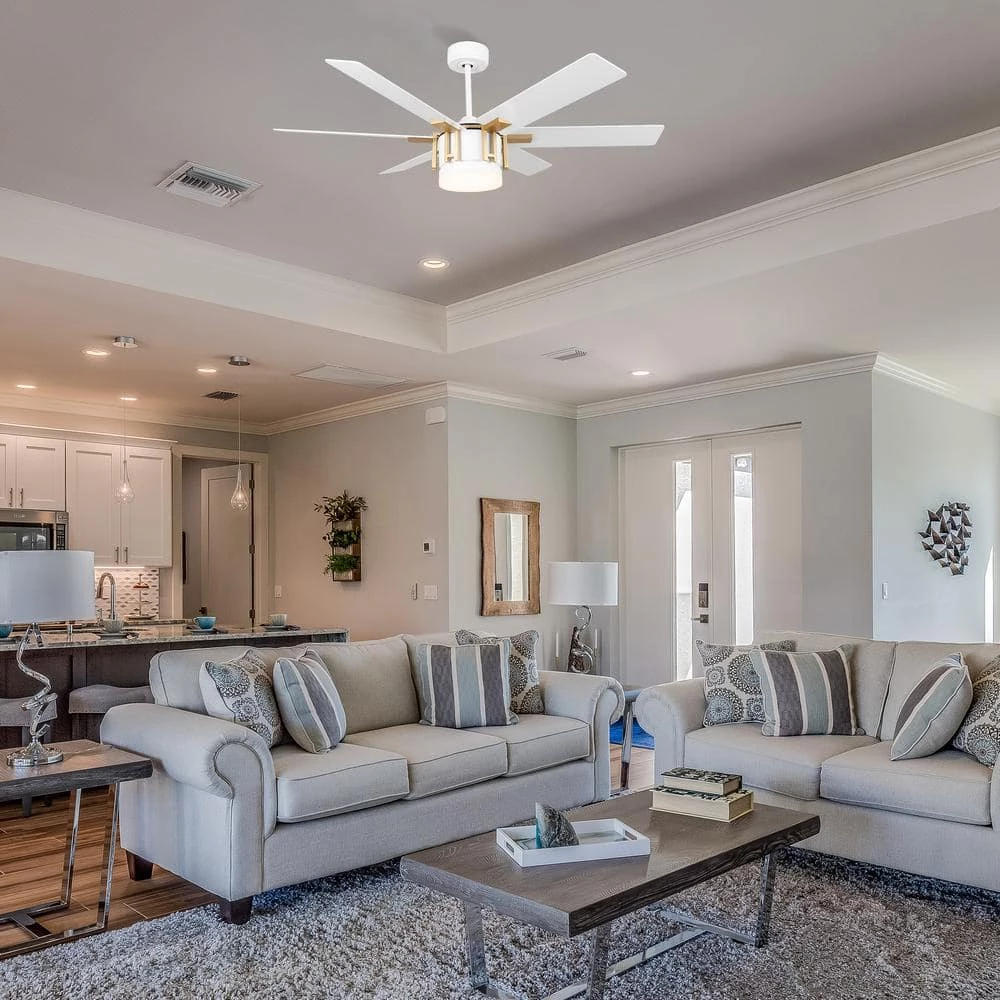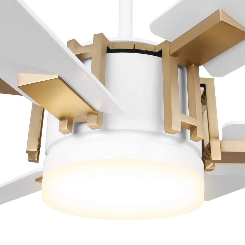 - Equipped with 6 contoured blades in a polished white and gold decor finish with a diameter of 52 in. to fit seamlessly into any space, large or small