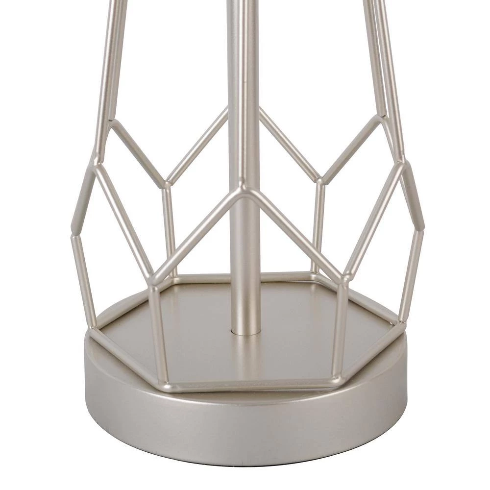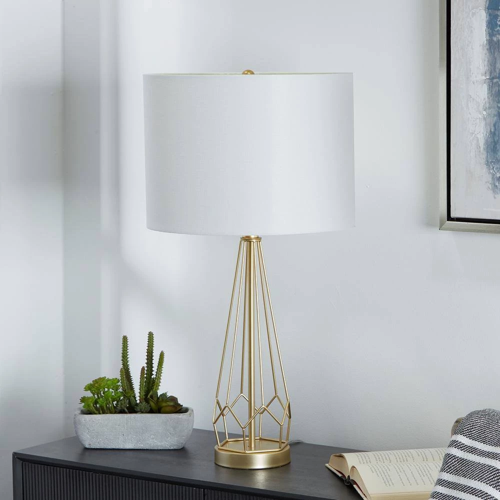 Keep your home open and airy with the Tinsley Gold Painted Geo Metal Wire Table Lamp. Painted in a lushious gold finish with a metal geo wire designed base. the Tinsley offers tons of style without overcrowding your decor. Place it in your bedroom for nighttime leisure activities or in your living area to create an ambience of peace and tranquility. The 3 way switch with the use of an 100-Watt bulb, not included, makes the desired atmospheric effect an enjoyable pleasure as you’re able to adjust the lighting to fit your needs. Constructed of metal and measures 26.25 in. H x 14 in. W x 14 in. D.